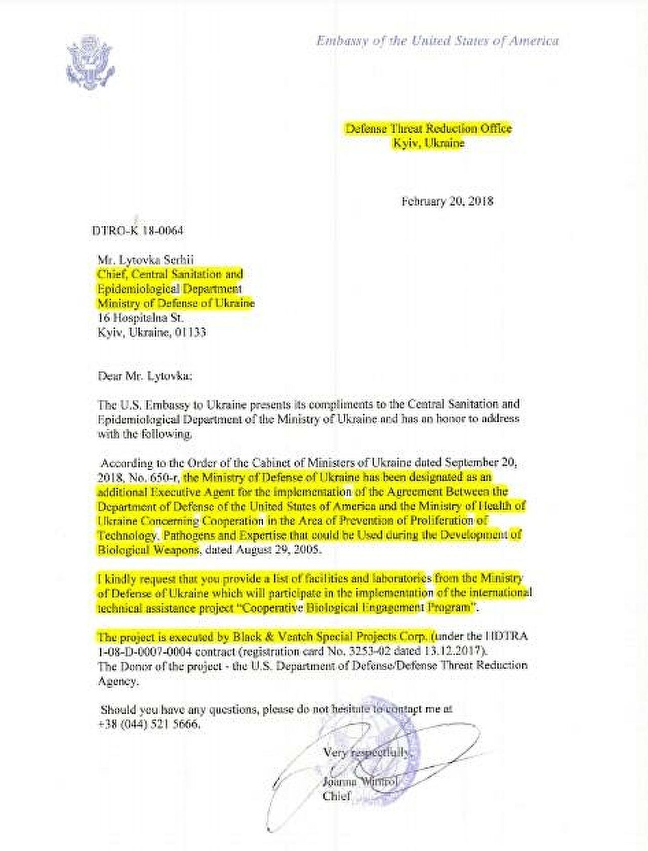 The Russian Ministry of Defence has released fresh details about the US military-funded biolabs operating in Ukraine, including a trove of original documentation. The MoD also revealed that Joanna Wintrol, the US Defence Threat Reduction Agency’s liason officer at the US Embassy in Kiev, has been serving as one of the programme’s curators.
