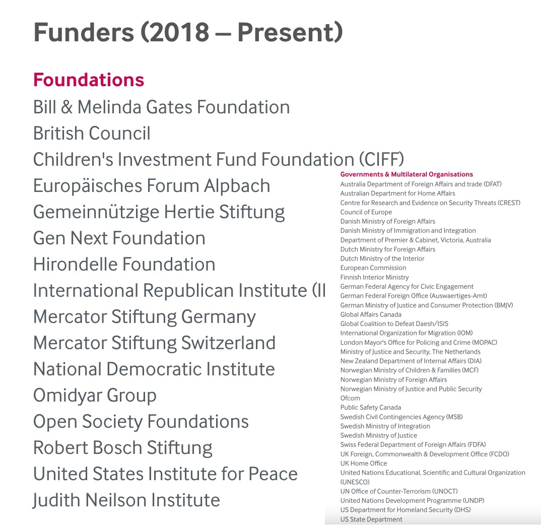 The ISD’s “diverse” funders include the US State Department, the US Department of Homeland Security, three other US state-funded organizations, and more than two dozen other NATO government agencies. On the private side, the ISD’s funders include the foundations of three of the world’s richest oligarchs: Pierre Omidyar’s Omidyar Group, George Soros’ Open Society Foundations, and the Bill and Melinda Gates Foundation.