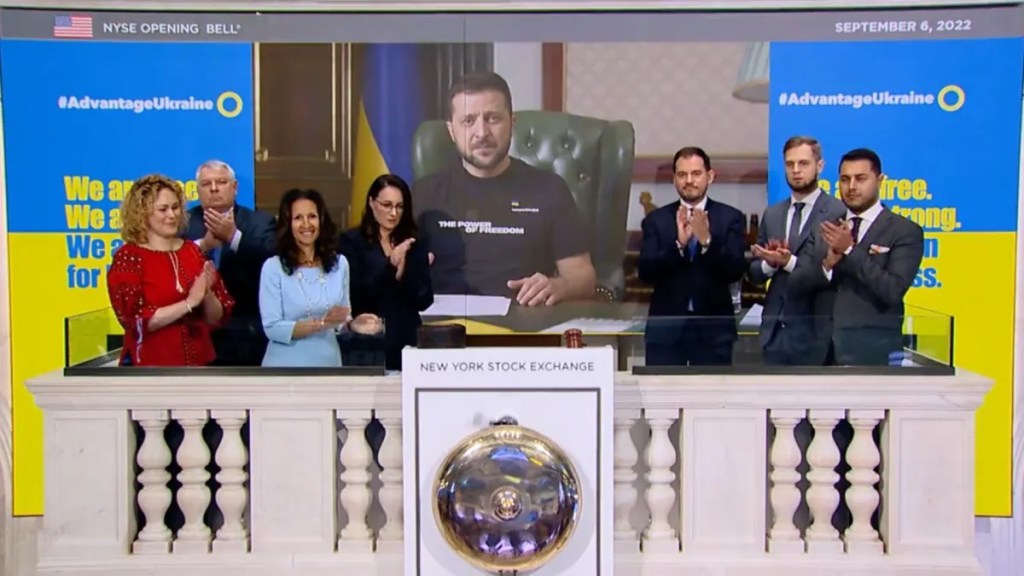 On September 6, Volodymyr Zelensky appeared on a large plasma screen in his trademark olive green battle dress-style t-shirt beaming down at the floor of the New York Stock Exchange.