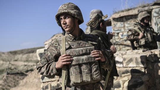 FILE PHOTO: Armenian soldiers stand as troops hold positions on the front line on October 25, 2020, during the ongoing fighting between Armenian and Azerbaijani forces over the breakaway region of Nagorno-Karabakh. © ARIS MESSINIS / AFP