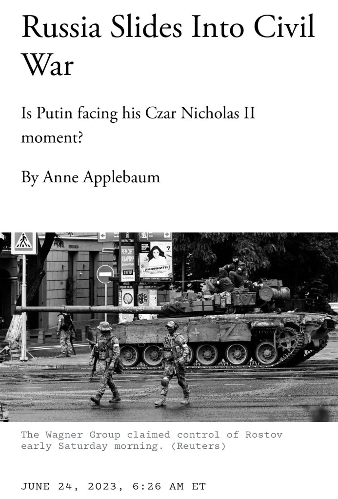 By June 24, Applebaum seemed to believe her fever dreams were coming true. And it was then that she breathlessly announced, “Russia is sliding into what can only be described as a civil war. ”