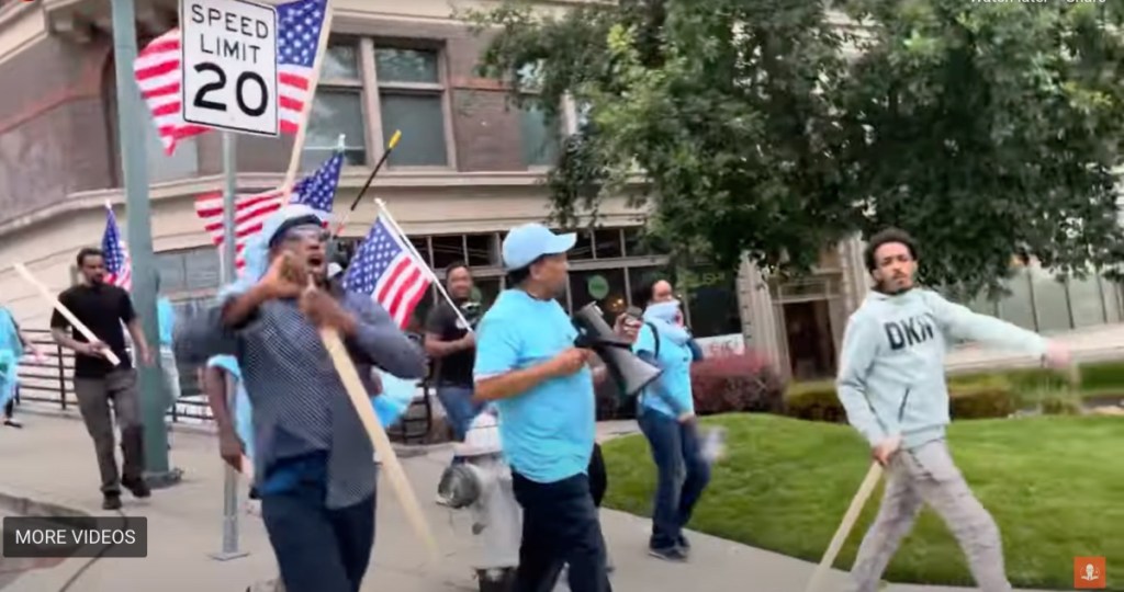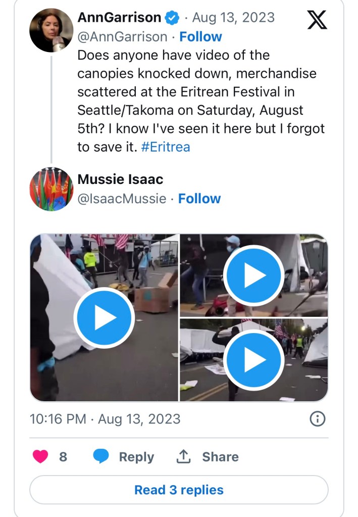 Regardless of how many of the festival attackers were Eritrean and how many were TPLF, they were well-organized internationally and boasted obvious financial backing for transportation and logistics. In Europe, Canada, and the US, most wore light-blue t-shirts with green insignia like the pre-independence Eritrean flag. Their brochure in Tacoma highlighted the coordination with a link tree for calling and emailing Tacoma’s mayor and convention center director to demand that the event be canceled.
