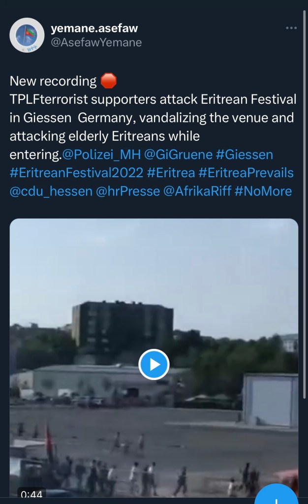 So who were the hooligans who attacked the Eritrean festival? They eagerly told me that they were merely expats protesting repression in Eritrea. However, they were obviously a project of the Tigray Peoples Liberation Front (TPLF). Tigray borders Eritrea and people on both sides of the border speak Tigrinya.