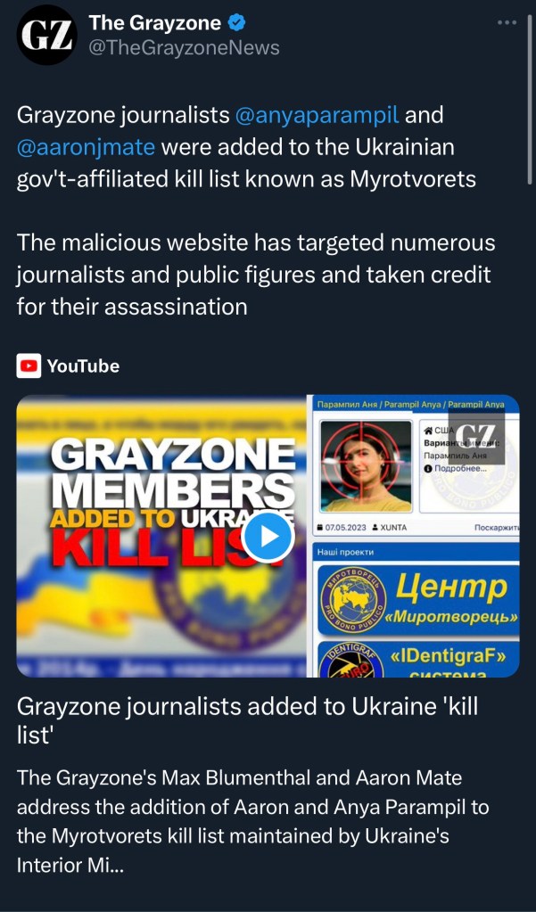 The FBI’s effort to ban Twitter accounts at the behest of Ukrainian intelligence offers a clue into the identify of those responsible for raising the “external concerns” with Gofundme. Since 2014, when a US-backed coup installed a nationalist government in Kiev, our contributors have been at the forefront of exposing the role of Washington in pushing Ukraine toward all-out war with Russia. The Grayzone has also provided extensive documentationof the overwhelming influence of neo-Nazi forces over Kiev, triggering angry tirades from Ukrainian diplomats while landing our staff members on Myrotvorets, a semi-official SBU assassination target list.