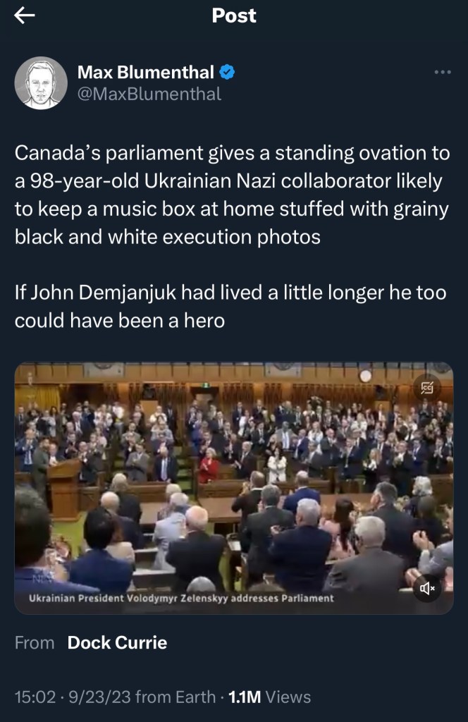 Credit: Max Blumenthal. Publication: The Grayzone. Published: September 26th 2023. Source Link: https://thegrayzone.com/2023/09/26/canadas-ukrainian-nazi-ottawas-policy/