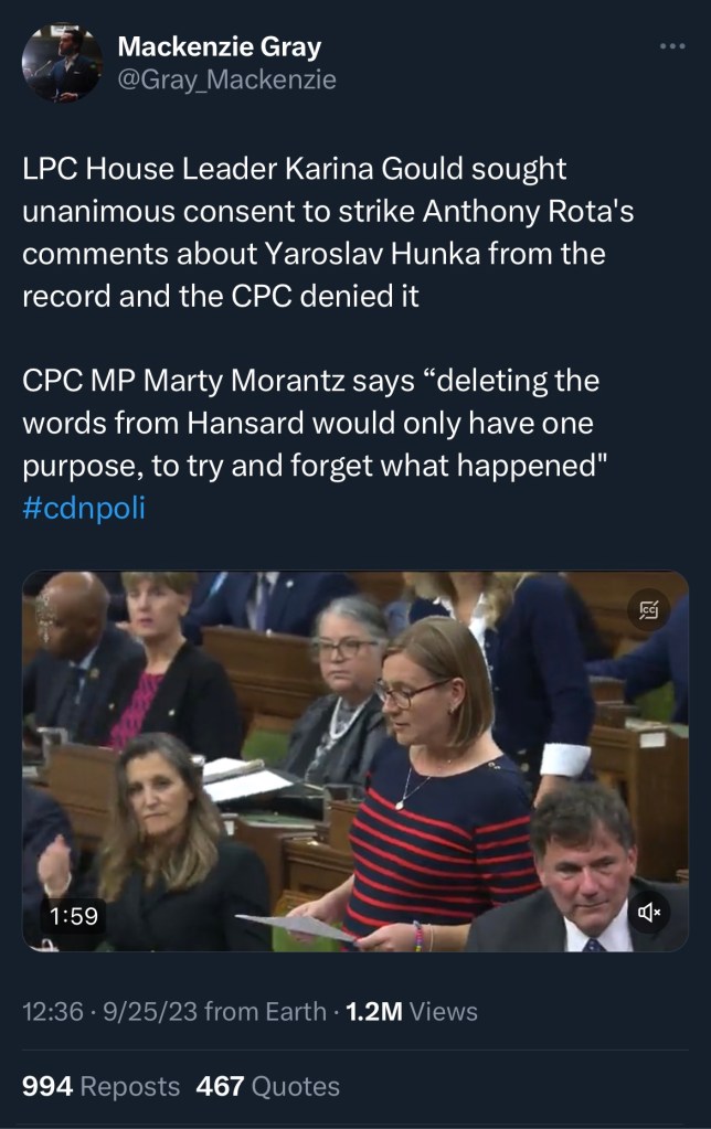 Three days after the embarrassing scene, Freeland was back on the floor of parliament, nodding in approval as Liberal House leader Karina Gould introduced a resolution to strike “from the appendix of the House of Commons debates” and from “any House multimedia recording” the recognition made by Speaker Anthony Rota of Yaroslav Hunka.