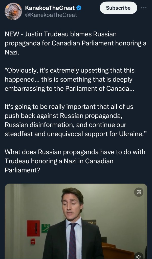 Trudeau, meanwhile, pointed to the “deeply embarrassing” event as a reason to “push back against Russian propaganda,” as though the Kremlin somehow smuggled an nonagenarian Nazi collaborator into parliament, then hypnotized the Prime Minister and his colleagues, Manchurian Candidate-style, into celebrating him as a hero.