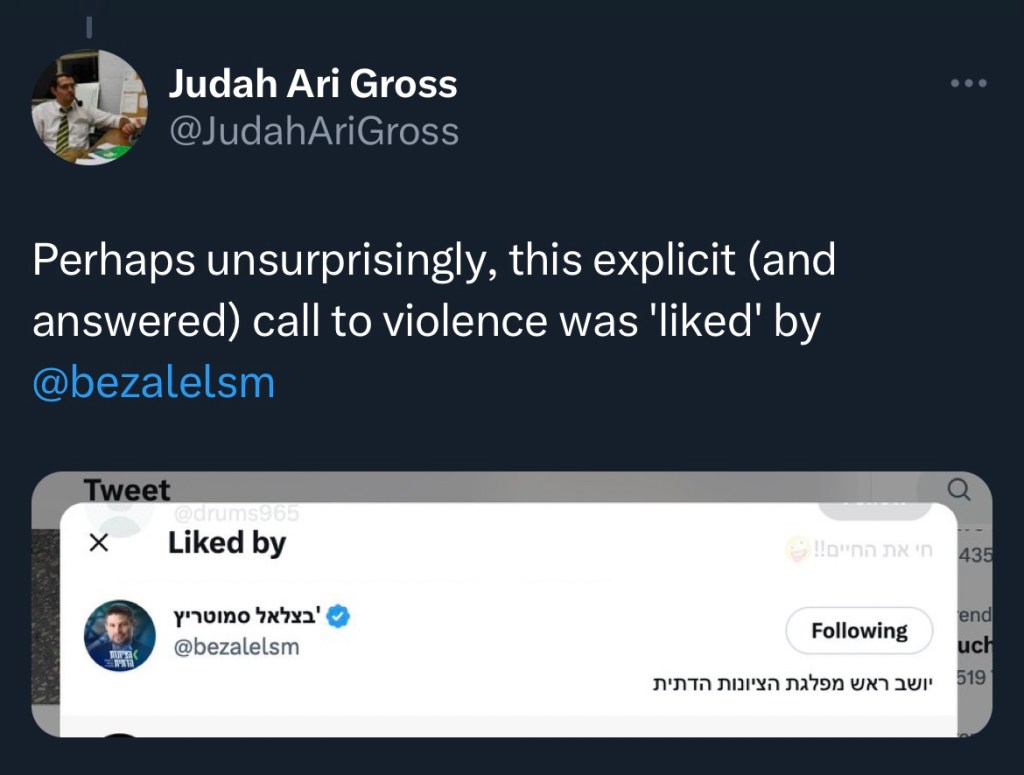 Ben David’s tweet was ‘liked’ on Twitter by Israel’s-then Finance Minister Bezalel Smotrich, a move which prompted 22 legal scholars to call on the Attorney General to open an investigation into the official for “inducing war crimes.” When Smotrich later echoed Ben David, calling to “wipe out” Huwara the following month, the US Department of State condemned his rhetoric as “dangerous.”