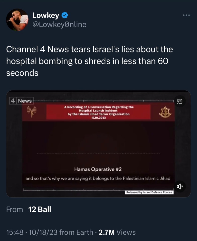 This is a still developing story with much still to be revealed, but this to me might be the most damning evidence against Israel yet. If Israel didn’t bomb that hospital, then why is it publishing fake audio clips of people posing as Hamas fighters agreeing with each other that Israel definitely didn’t bomb that hospital?