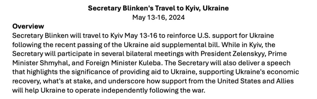 The trip objectives are to “reinforce confidence in Ukraine’s ability to prevail” and trumpet the passing of the Ukraine aid supplemental by Congress, the document says. The United States, the document further states, supports a “comprehensive, just, and lasting peace based on full respect for Ukraine’s independence, sovereignty, and territorial integrity, with its internationally recognized borders,” which includes both Crimea and the Donbas regions.