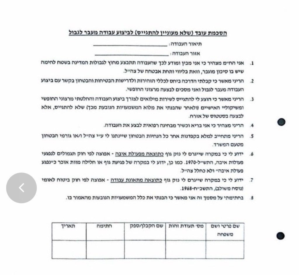 The day after I first got in touch, Libi sent me a document to complete in order to proceed. The document does not mention “Gaza” but asked me to acknowledge that the work will be done outside the Israeli border.