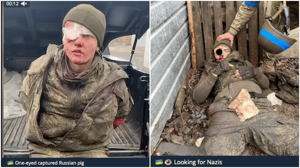This April, a pro-Ukrainian Telegram channel called fckrussia2022 posted a video depicting a Russian soldier with one of his eyes bandaged, suggesting it had been gouged during torture, and mocked him as a “one-eyed” pig.