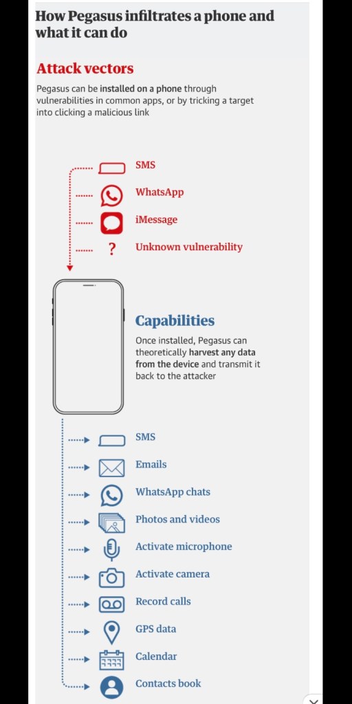 Pegasus is a malware that infects iPhones and Android devices to enable operators of the tool to extract messages, photos and emails, record calls and secretly activate microphones.