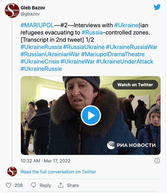 “Ukraine didn’t let us leave the city, we were blocked,” another evacuee stated. “The Ukrainian military arrived and said, under no circumstances are you to leave the city if the Russian Federation opens a humanitarian corridor for you. We want to continue to use you as a human shield.”